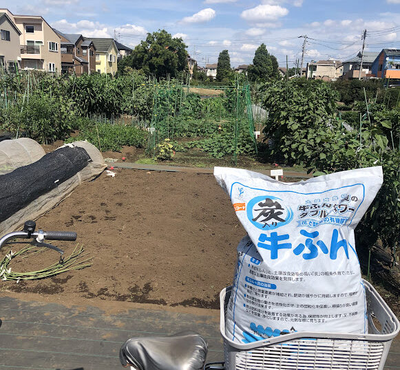 先週、9月24日に堆肥をすき込みにひとり畑作業へ。40リットル20キロくらいある堆肥を自転車で運ぶ、いつものど根性スタイルです。この日は、意外にも熱くて、耕していたら汗だくになりました・・